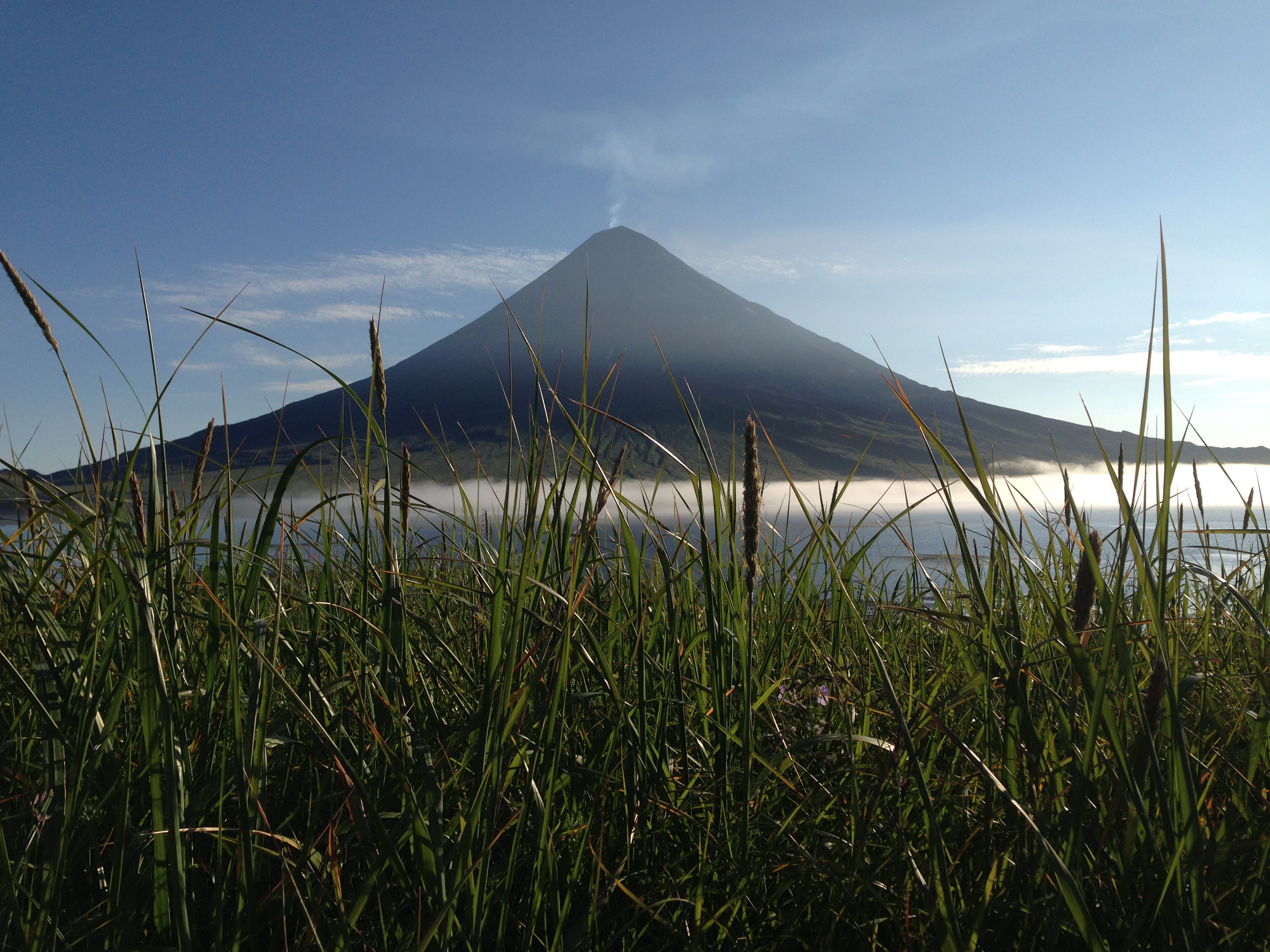A lazy plume of volcanic gas rises above the summit crater of Cleveland volcano. Photo taken during the 2014 field season of the Islands of Four Mountains multidisciplinary project, work funded by the National Science Foundation, the USGS/AVO, and the Keck Geology Consortium.
