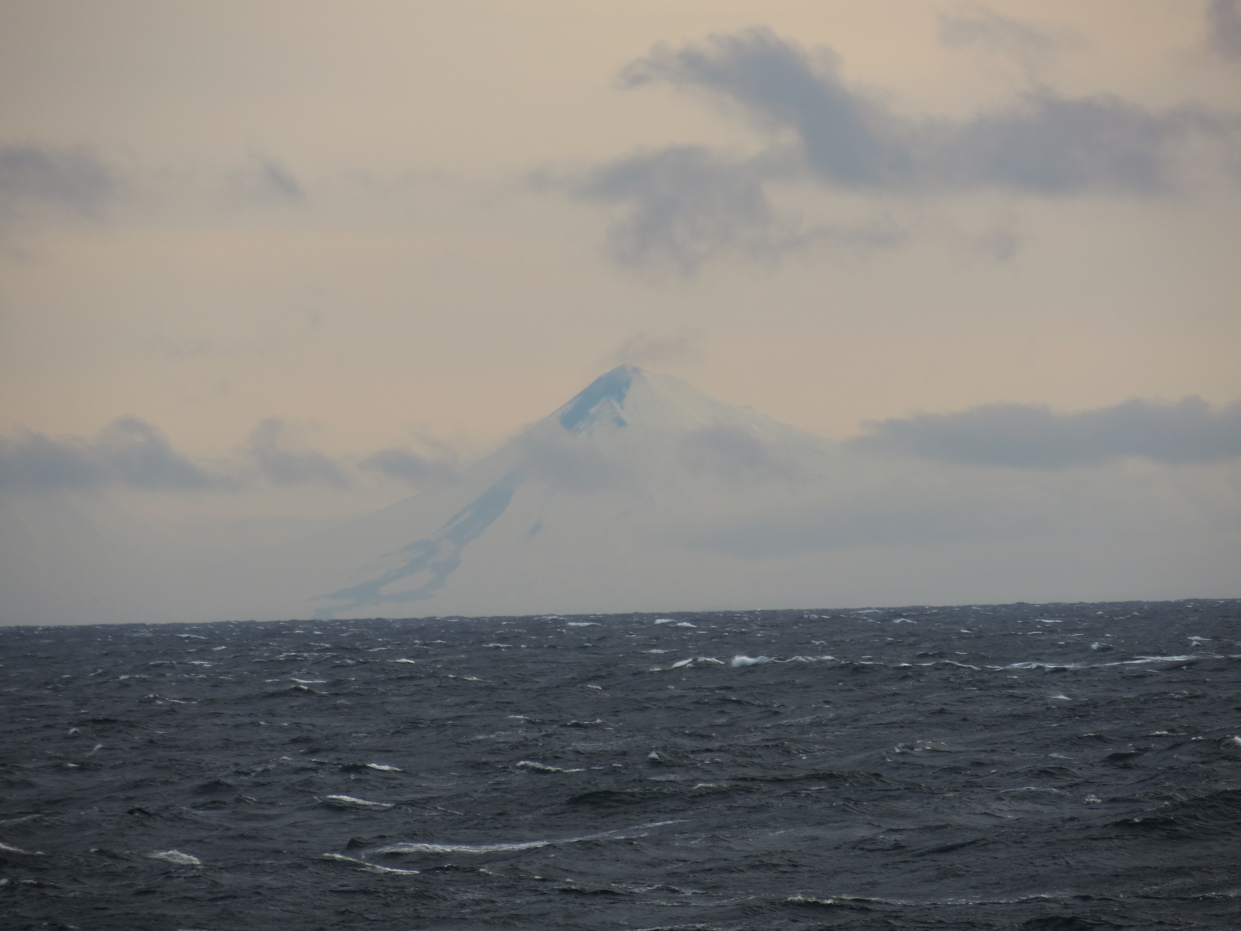 Lava flows and lahar deposits on the northwest flank of Pavlof volcano. Photo taken approximately 50 miles WNW of Pavlof aboard a fishing vessel on the afternoon of November 26, 2014. Photo courtesy of Levi Musselwhite.