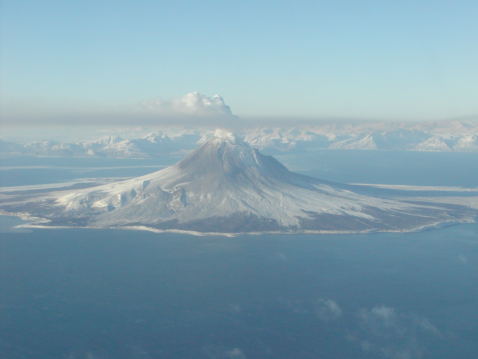 A continuous plume of gas rises from the summit of Augustine Volcano on January 24, 2006, creating a brown-gray haze southeast of the volcano.