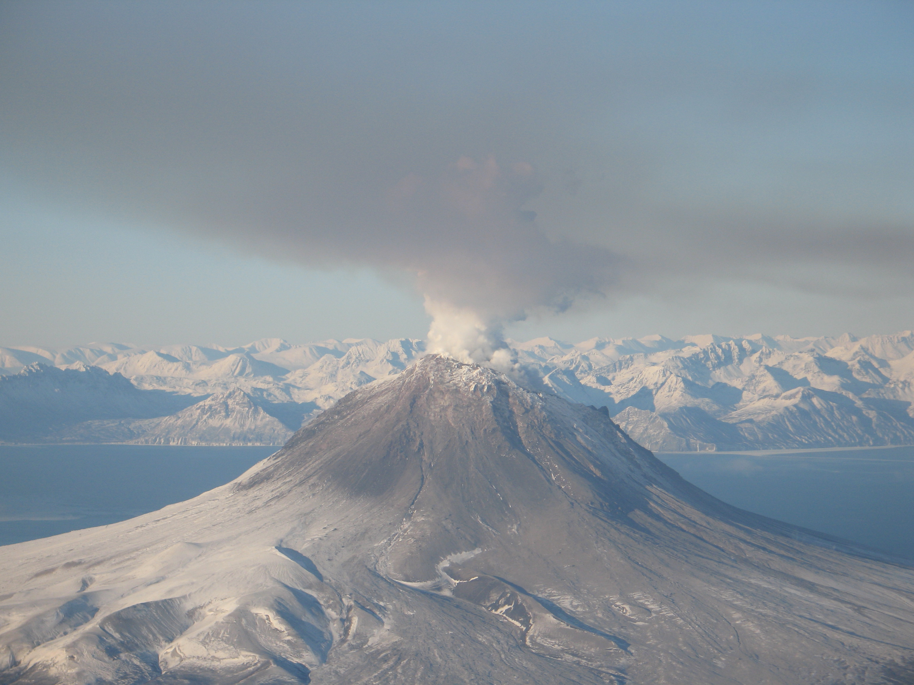 Augustine Volcano on January 24, 2006. Steam and gas plume is drifting to the S SE. The pinkish/brown haze in the foreground is smog from volcanic gases in the plume. This photo was taken during a gas flight where a fixed-wing plane flies through the diffuse plume measuring gases.