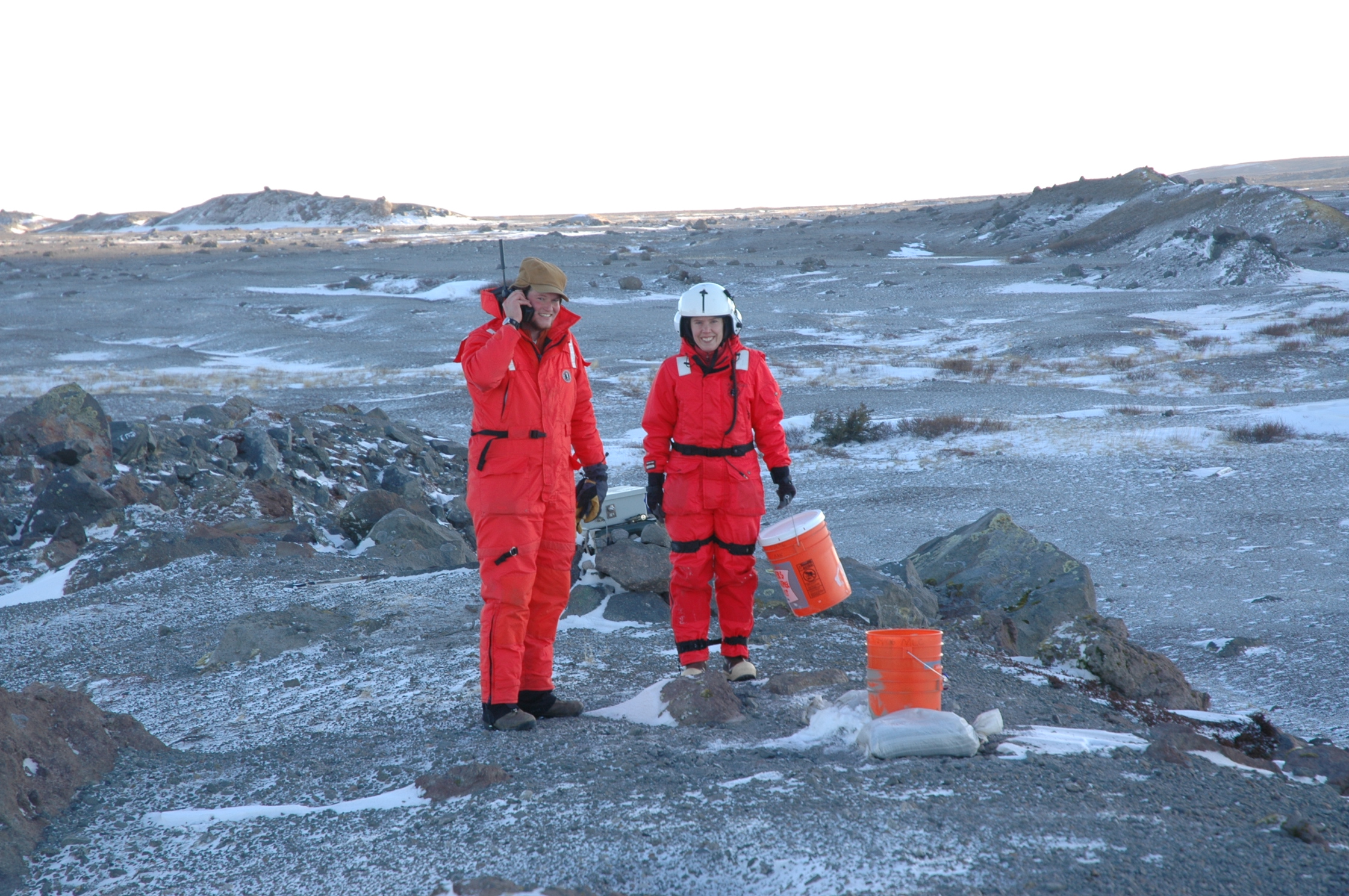 Cyrus Read calls in to the office and Michelle Coombs carries a recently collected ash bucket at Burr Point.