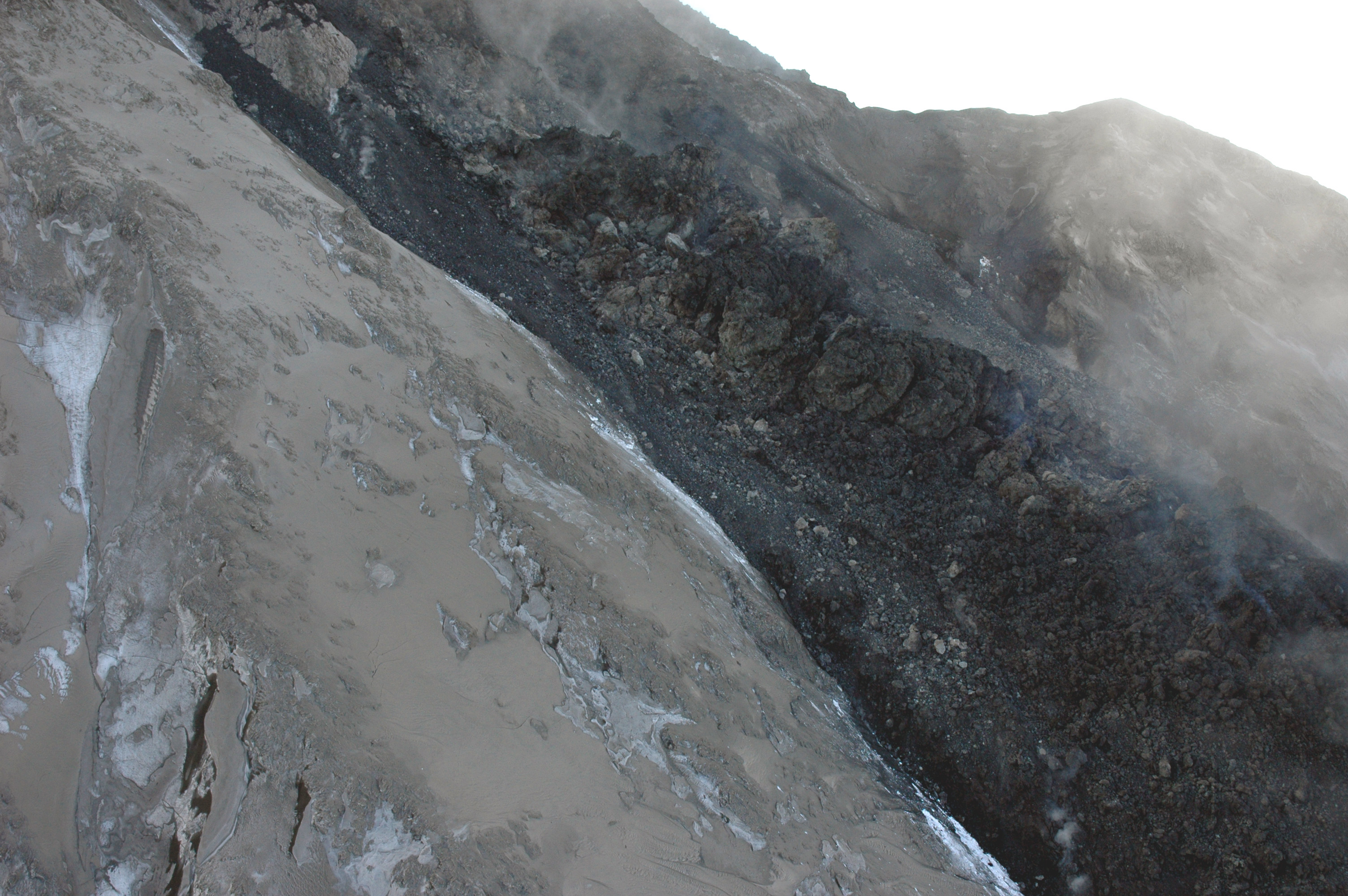 Close-up view of advancing lava flow on north-northeast flank, below the active lava dome.