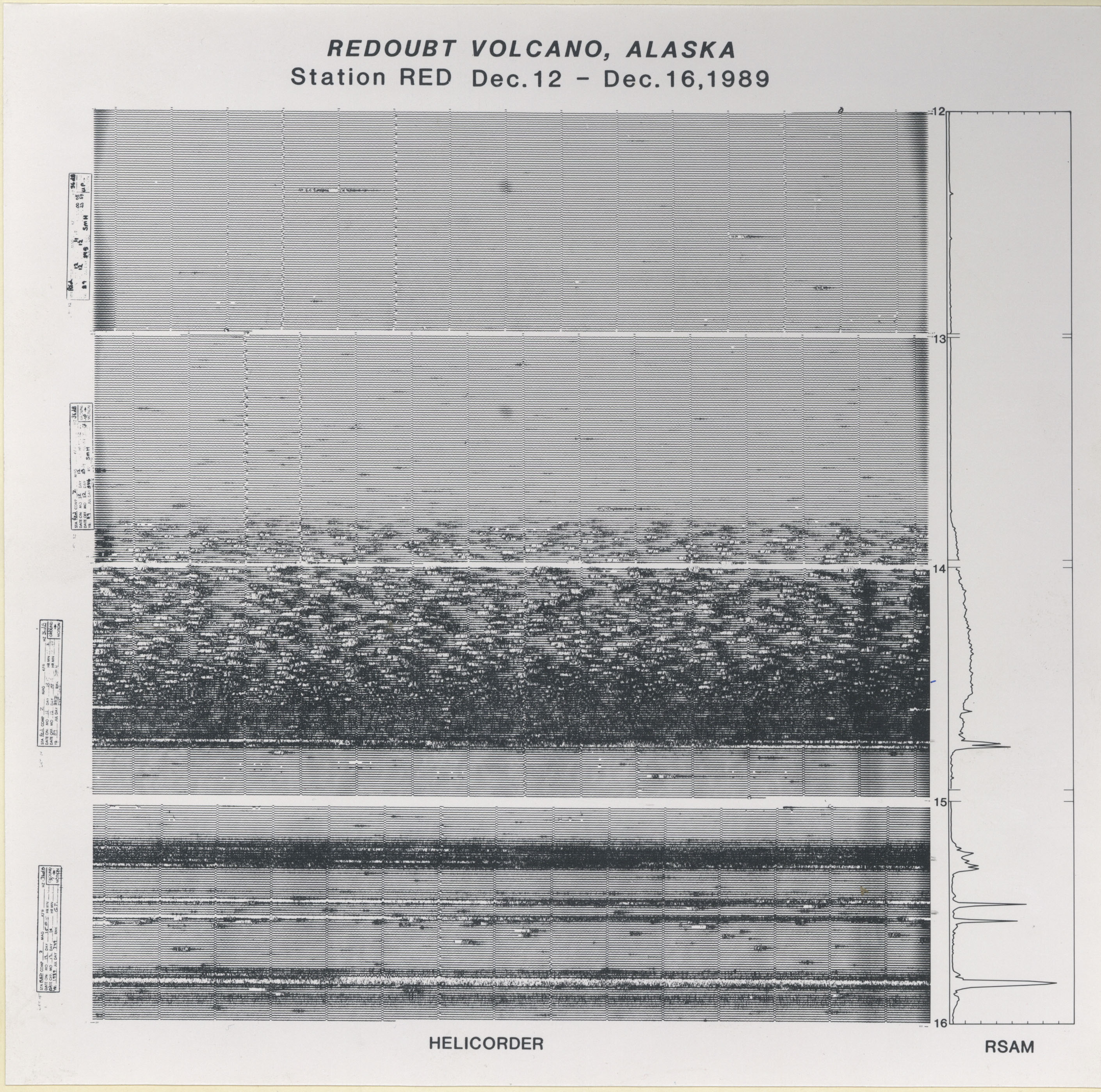 Helicorder record for Redoubt eruption between December 12 - 16, 1989. Eruption continued until June, 1990.