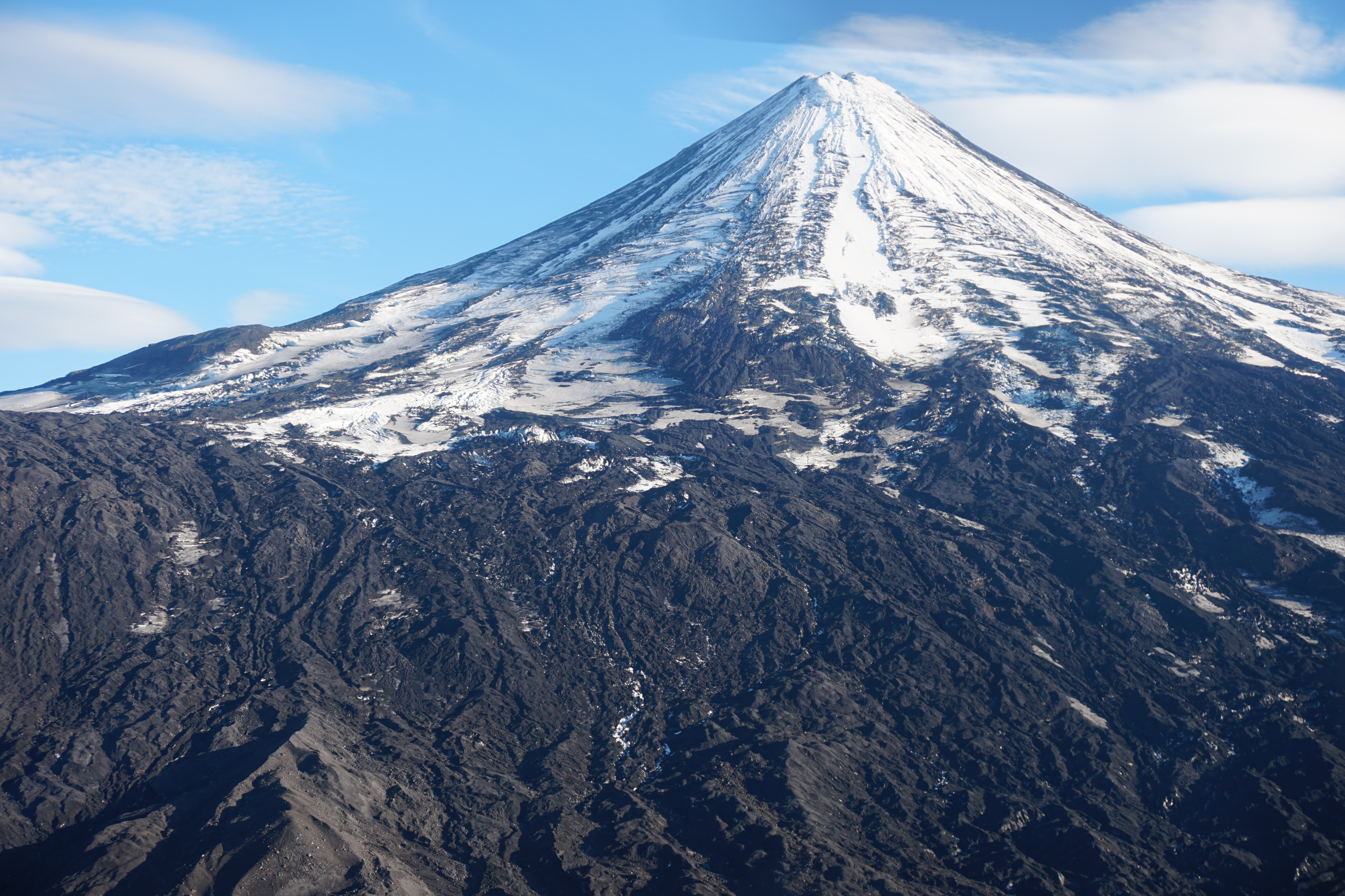 Shishaldin Volcano viewed from the north. Lava flows from the 2019 eruption are visible in the center of the image.