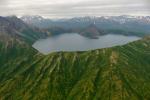 From Wood and Kienle (1990) [1] : "Kaguyak is a stratovolcano abbreviated by a caldera. The highest point on the caldera rim (901 m) is over 550 m above a crater lake (depth >180 m) that partially fills the caldera. The lake is 2.5 km in diameter. Exposed in the walls of the caldera are pre-caldera agglomerates, lava flows, dikes, and some small plugs. A saddle on the northwest rim of the caldera represents a pre-caldera stream valley that was beheaded by caldera formation."An extensive apron of pyroclastic flow deposits surrounds Kaguyak crater. These deposits consist of white dacitic tephra and pumice and are the result of the caldera-forming eruptions. Immediately after eruption, the pyroclastic flows filled the stream valleys around the volcano. Subsequent stream erosion has provided exposures up to 30 m thick of the pyroclastic flows, but the base of the deposits has not been observed. A paleosol immediately on top of the pyroclastic flow deposits yields a C14 date of 1,060 yr BP; this is a minimum age for the caldera-forming eruption. The caldera has not been modified by glacial activity, thus making its origin post-glacial.