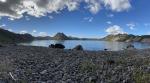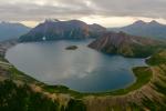 "Both pre- and post-caldera domes are found at Kaguyak Crater. A pre-caldera dome (elevation 706 m) on the southeast flank of the volcano is heavily mantled by caldera-related pumice, while a post-caldera dome (elevation 616 m) on the east flank does not have any pumice mantle. Within the caldera two large post-caldera domes (elevation 614 m, 1 km diameter) have coalesced on the southwest edge of the caldera. A smaller dome forms an island rising ~10 m above the center of the lake. Weak solfataric activity has been reported from this dome but was not seen in 1982.